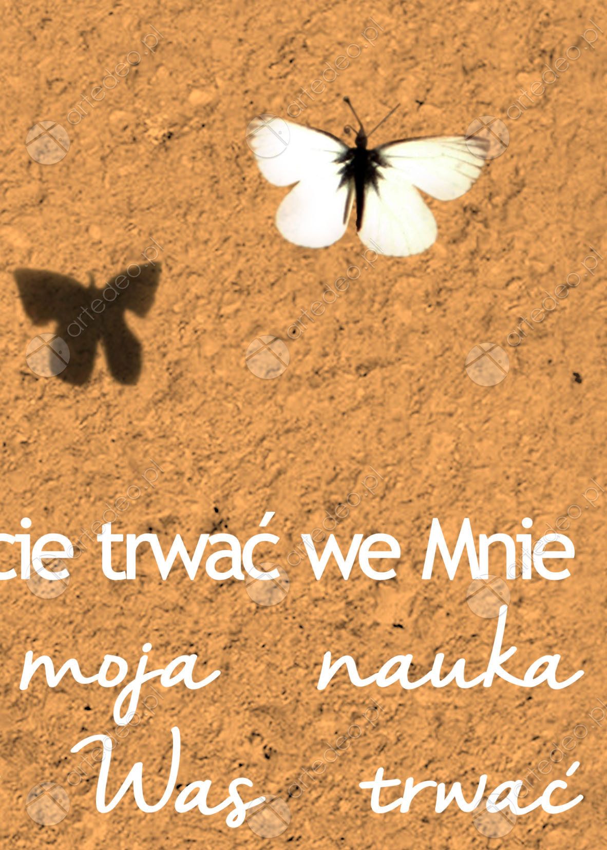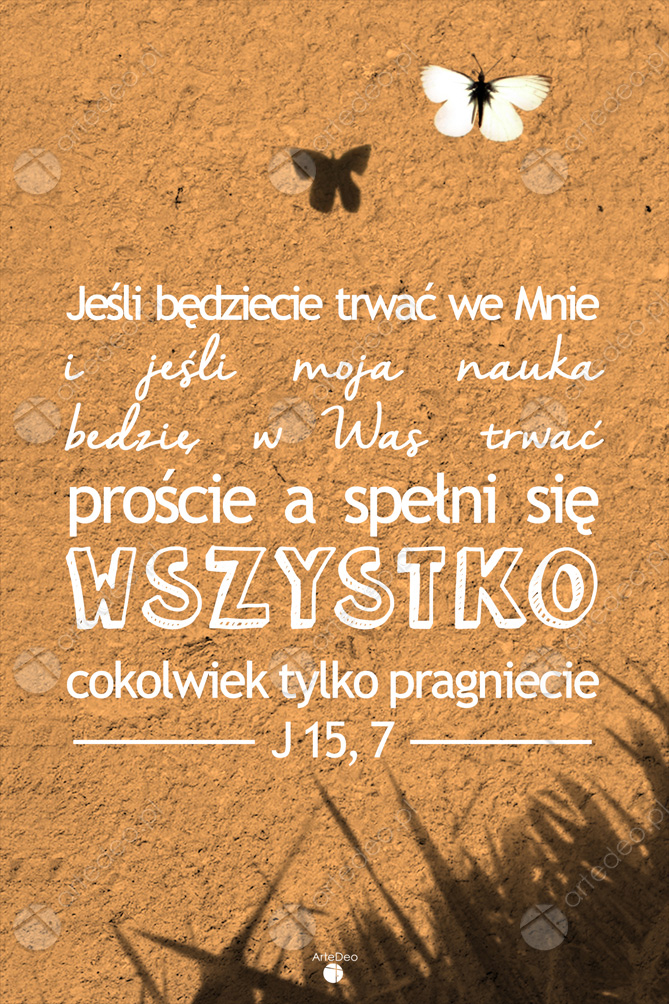Jeżeli będziecie trwać we Mnie i jeśli moja nauka będzie w Was trwać proście a spełni się wszystko cokolwiek tylko pragniecie. J 15. 7″ Autorska chrześcijańska grafika z cytatem, produkt gotowy do powieszenia na ścianie.