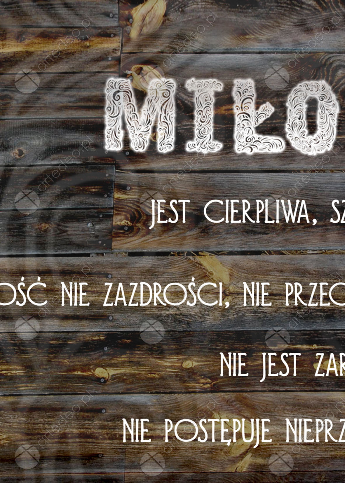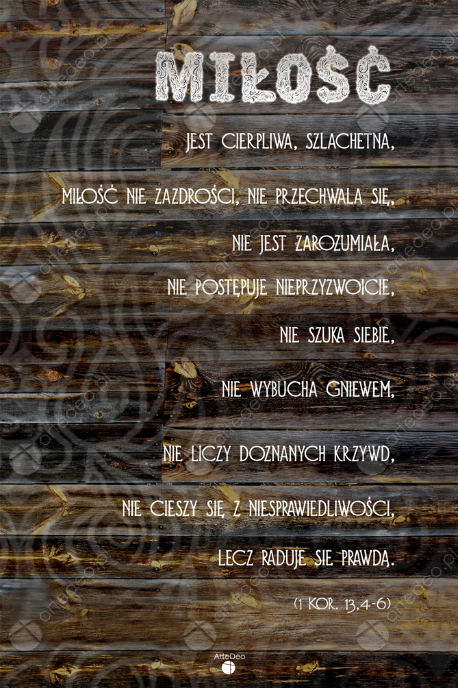 “Miłość cierpliwa jest, łaskawa jest. Miłość nie zazdrości, nie szuka poklasku, nie unosi się pychą; nie dopuszcza się bezwstydu, nie szuka swego, nie unosi się gniewem, nie pamięta złego; nie cieszy się z niesprawiedliwości, lecz współweseli się z prawdą. 1 Kor 13. 4-6″Autorska chrześcijańska grafika z cytatem, produkt gotowy do powieszenia na ścianie.