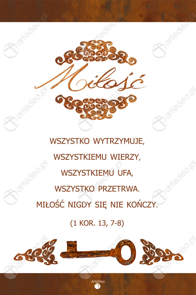 “MIŁOŚĆ – Wszystko znosi, wszystkiemu wierzy, we wszystkim pokłada nadzieję, wszystko przetrzyma. Miłość nigdy się nie kończy… 1 Kor 13. 7-8a” Autorska chrześcijańska grafika z cytatem, produkt gotowy do powieszenia na ścianie.