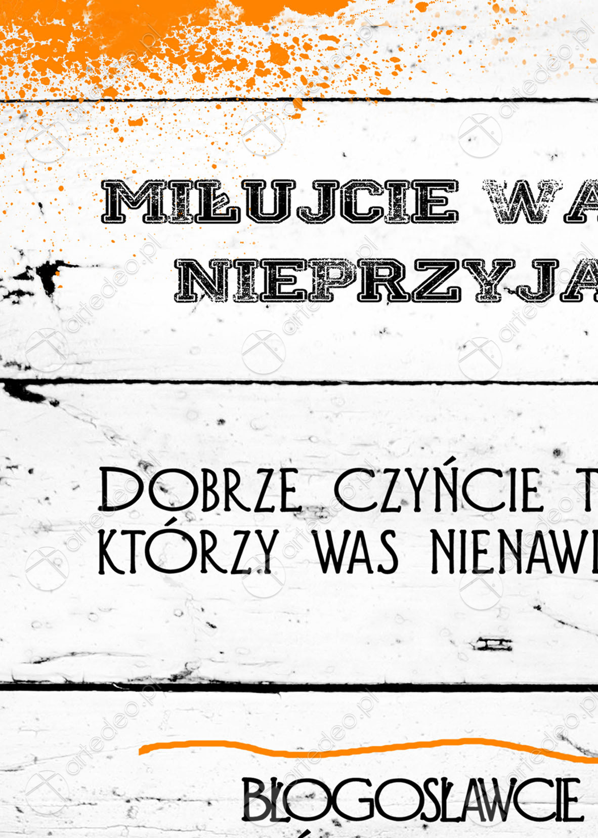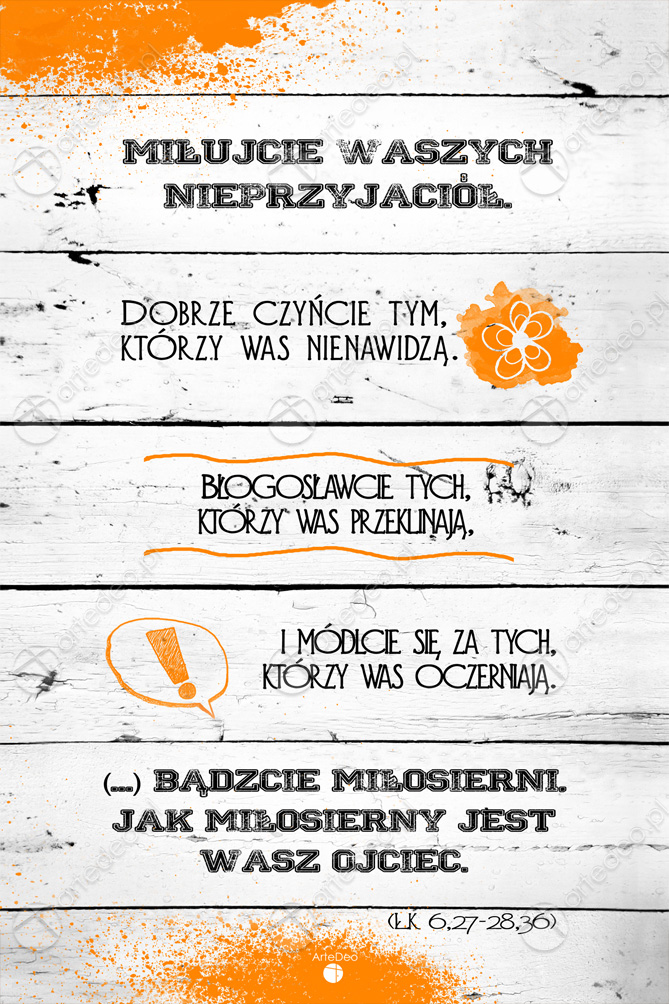“Miłujcie Waszych niprzyjaciół. Dobrze czyńcie tym, którzy was nienawidzą. Błogosławcie tych, którzy was przeklinają. I módlcie się, za tych, którzy was oczerniają. (…) Bądzcie Miłosierni. Jak miłosierny jest wasz Ojciec. Łk 6. 27-28,30” Autorska chrześcijańska grafika z cytatem, produkt gotowy do powieszenia na ścianie.
