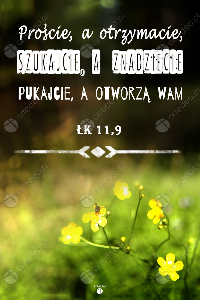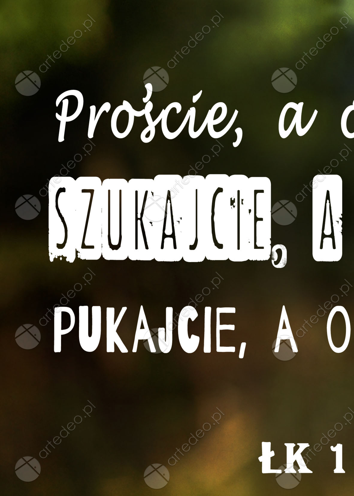 “Proście, a otrzymacie, szukajcie, a znajdziecie; pukajcie, a otworzą wam. Łk 11. 9” Autorska chrześcijańska grafika z cytatem, produkt gotowy do powieszenia na ścianie.