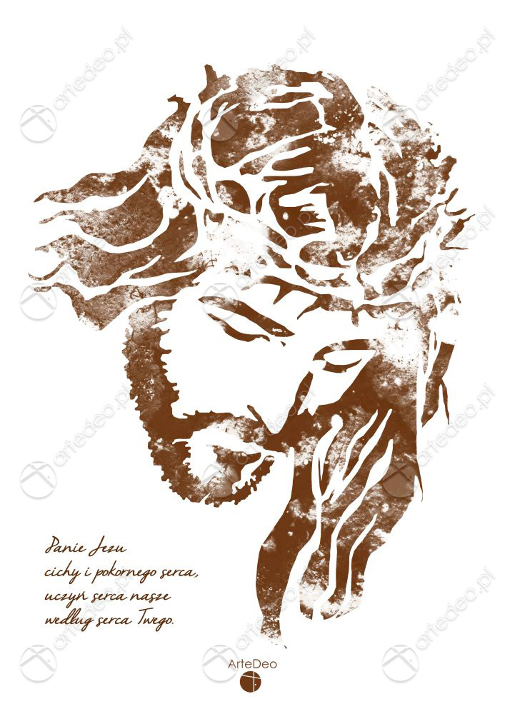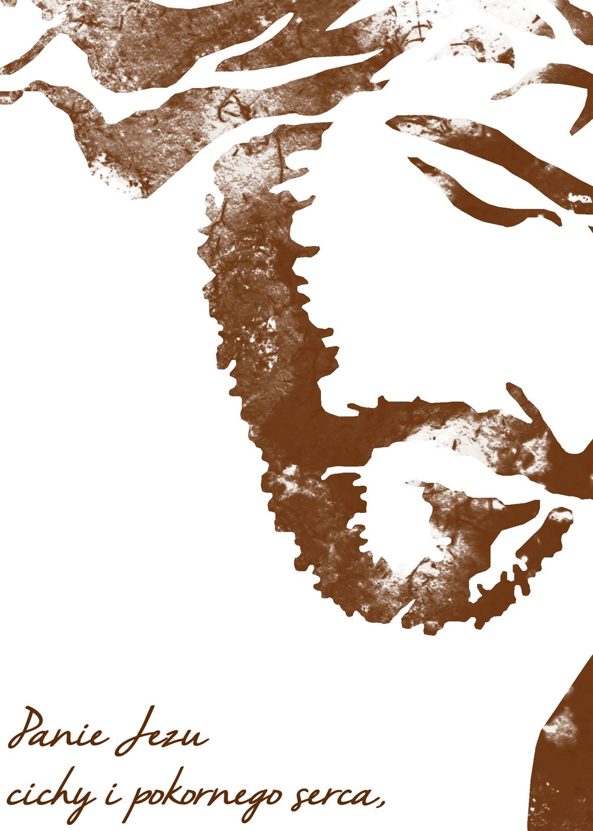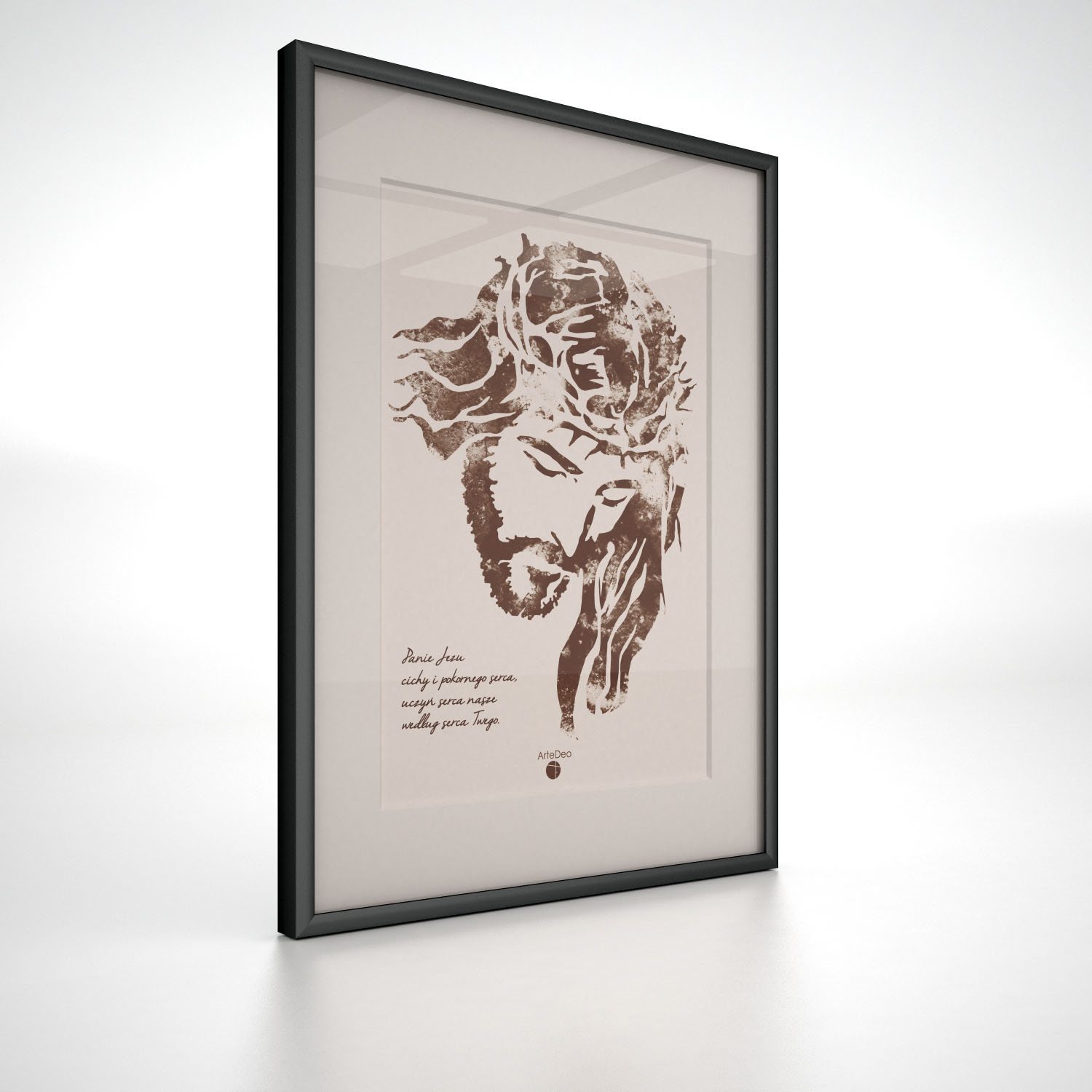 “Jezu cichy i pokorny, uczyń serca nasze według serca Twego.” Autorska chrześcijańska grafika z cytatem, produkt gotowy do powieszenia na ścianie.